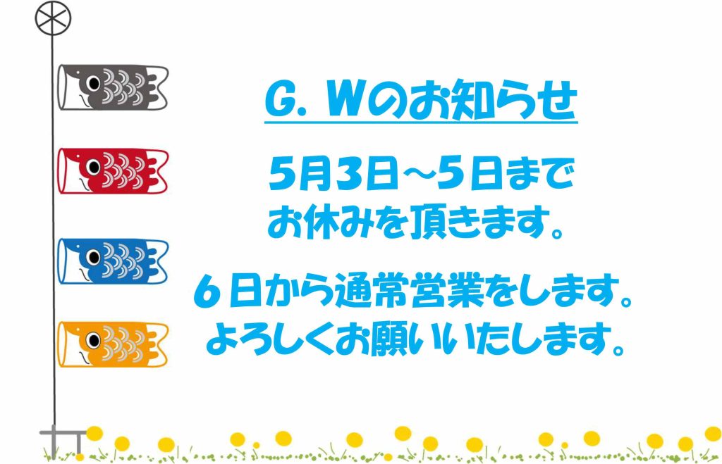 すでに大型連休の方もいらっしゃるかと思いますが、当店も明日から6日まで