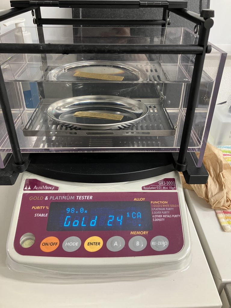 比重計と呼ばれる精密機器で金製を調べます。